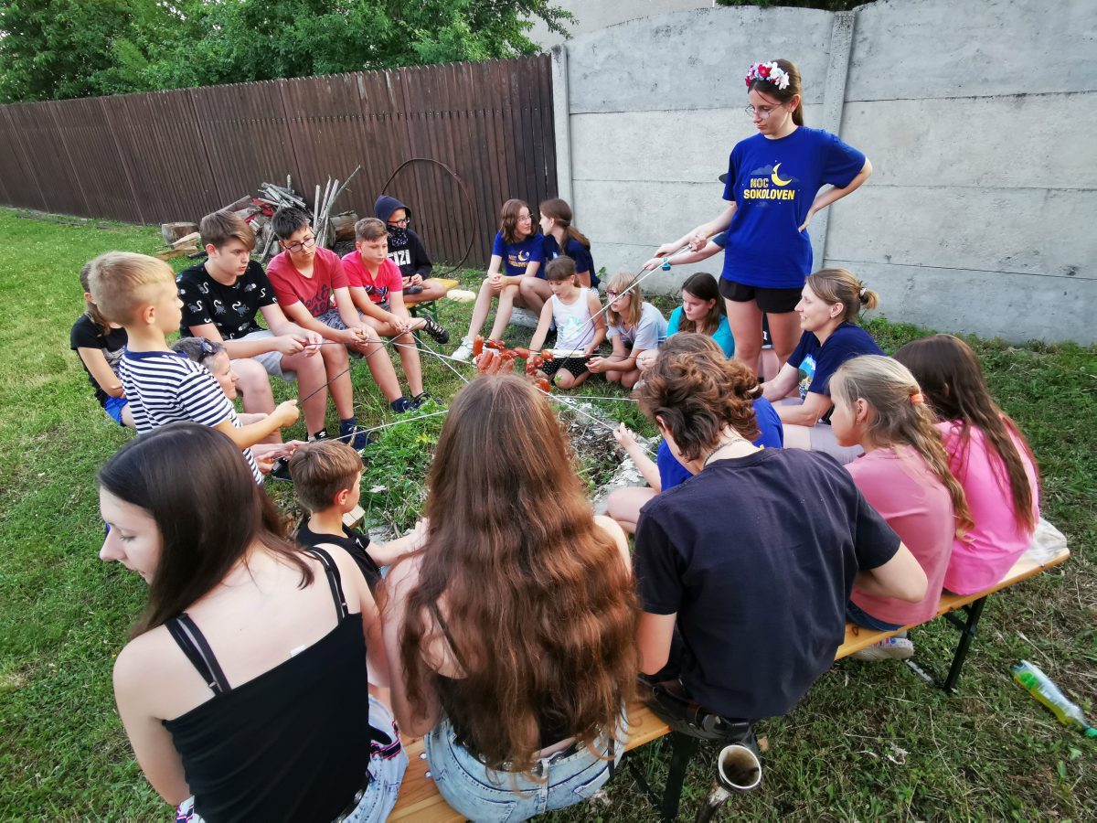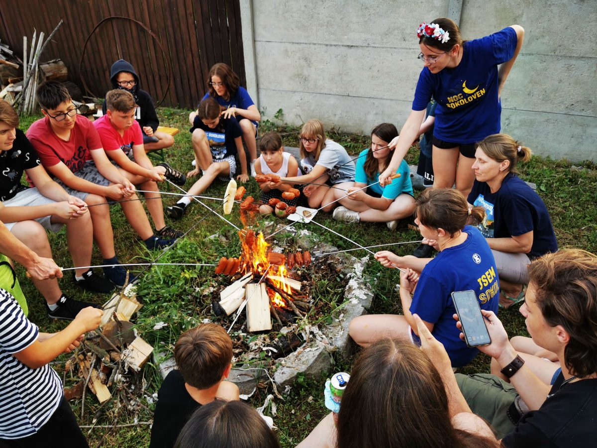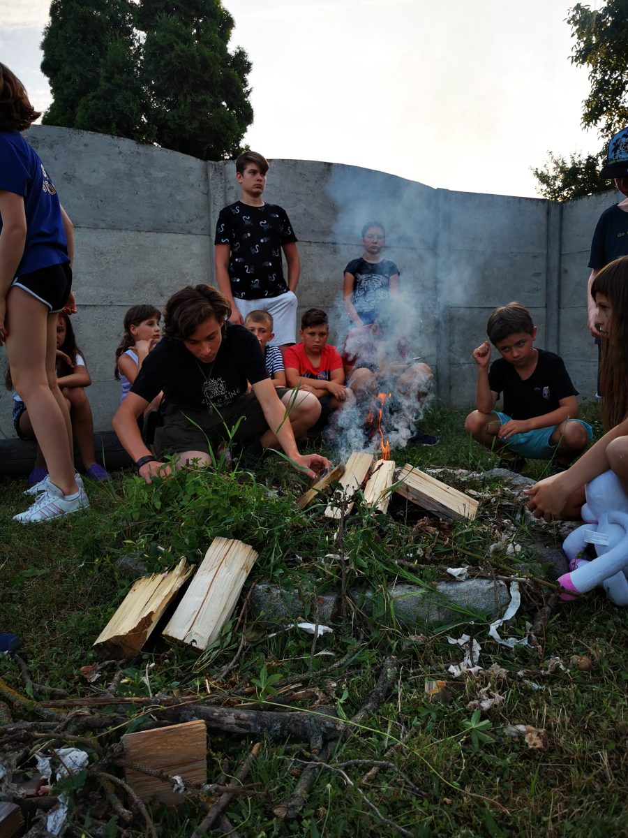 Mezi tím, pokud nás nezaskočí počasí, vybudujeme na trávníku vedle stanové městečko. Ti, kteří budou chtít na sokolovně přespat, tak si přinesou stan, případně se domluví mezi sebou ve skupinkách. Ve stanovém městečku si pak najdou místo a tam si stan postaví, nebo nás poprosí o pomoc. Dohasnutím táborového ohně nám začne večerka.